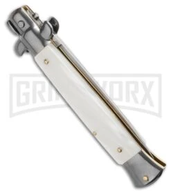 Frank B. 9″ Italian Stiletto White Pearlex Automatic Knife – Flat Grind