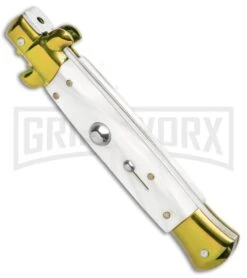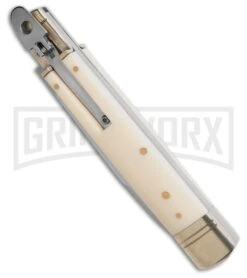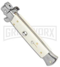 From AKC comes this striking swinguard stiletto. The polished bayonet blade and swing guard have an elegant and traditional look. The push button release is swift, the lock up is secure, and the sliding safety helps protect against the accidental release of the blade. Blade tang is stamped “AKC Italy.” This is a perfect piece to begin or enhance your Italian knife collection.