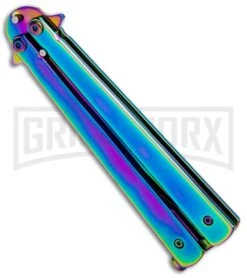 The Andux Skull Fly Trainer offers a sturdy design and a dull blade for safely practicing your favorite balisong tricks. The skeletonized handle is made from stainless steel with a grippy finish and a spring latch. It has a dull trainer blade made from 420 stainless steel with a dual tang pin design. Item includes a nylon belt sheath.