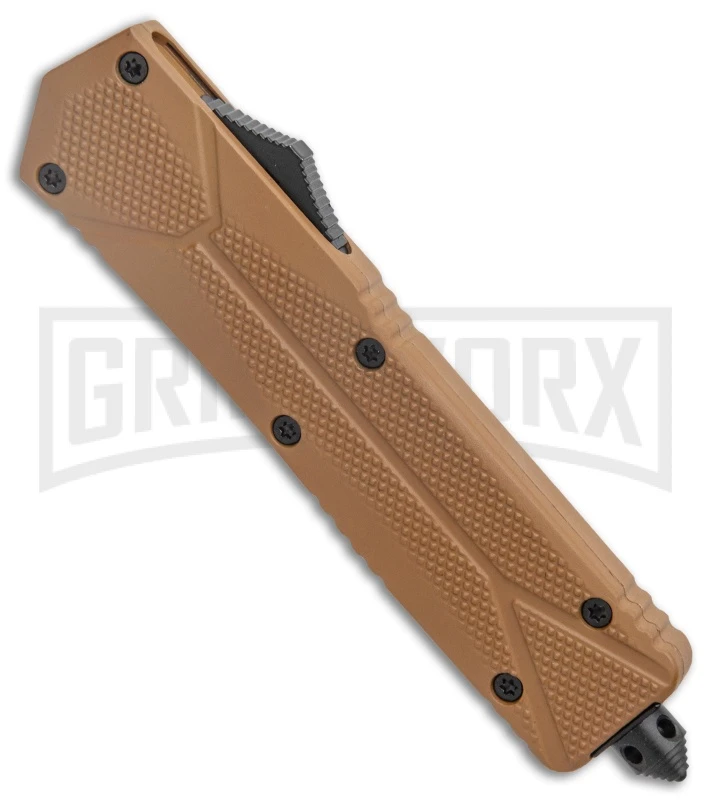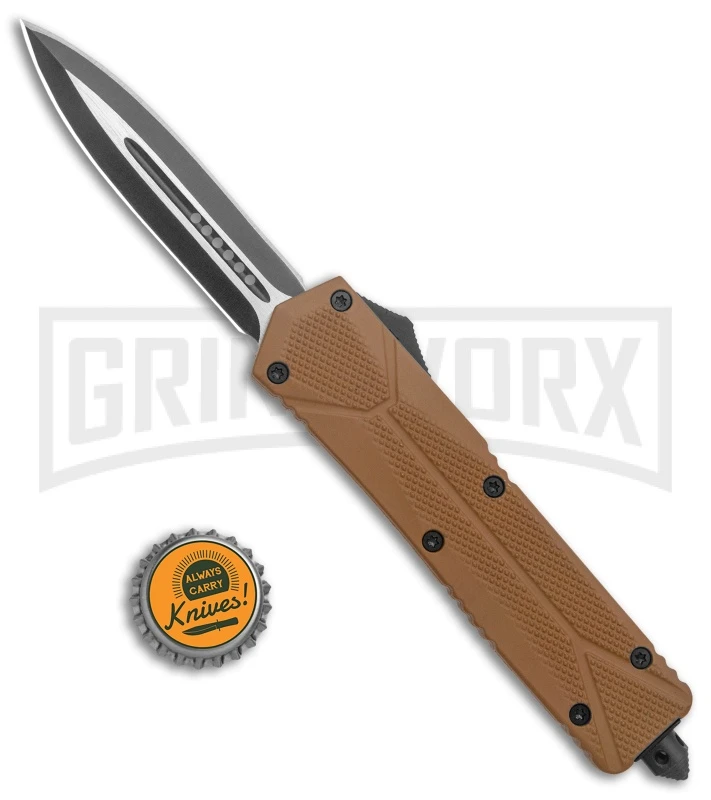 This Atomic OTF model has a brown aluminum handle with grippy texture and a two-tone finished dagger blade with plain edges.