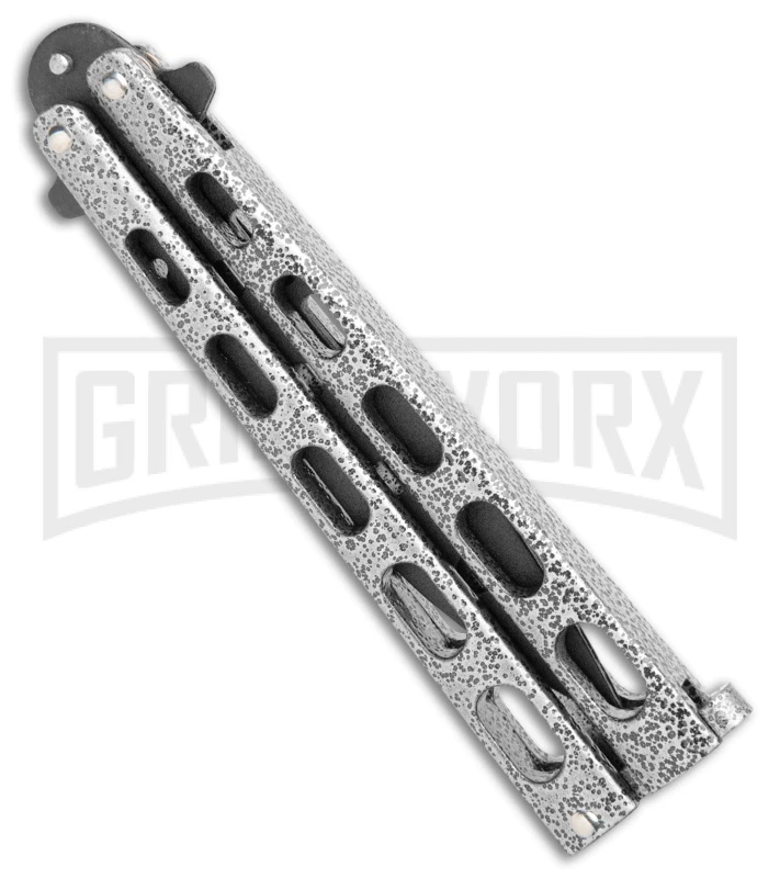 The Bear & Son 115TR butterfly knife trainer is built with durable silver vein epoxy coated zinc handles with a skeletonized design for reduced weight. It features a stainless steel drop point blade with a black coating.